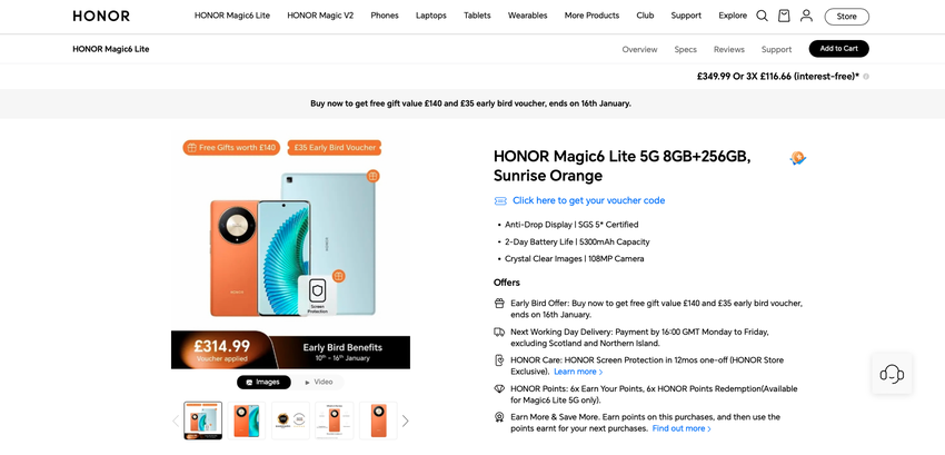 Die Rede ist von dem Modell Honor Magic 6 Lite. Das Gerät ist in einer 8/256 GB-Variante für 350 € erhältlich. Es sind auch drei Farben erhältlich: Orange, Grün und Schwarz. Übrigens, je nach Land, bietet der Hersteller das Honor Pad X8 Tablet, 22.5W SuperCharge Aufladung und TWS-Kopfhörer Honor Earbuds X5 als Geschenk zum Gerät an.