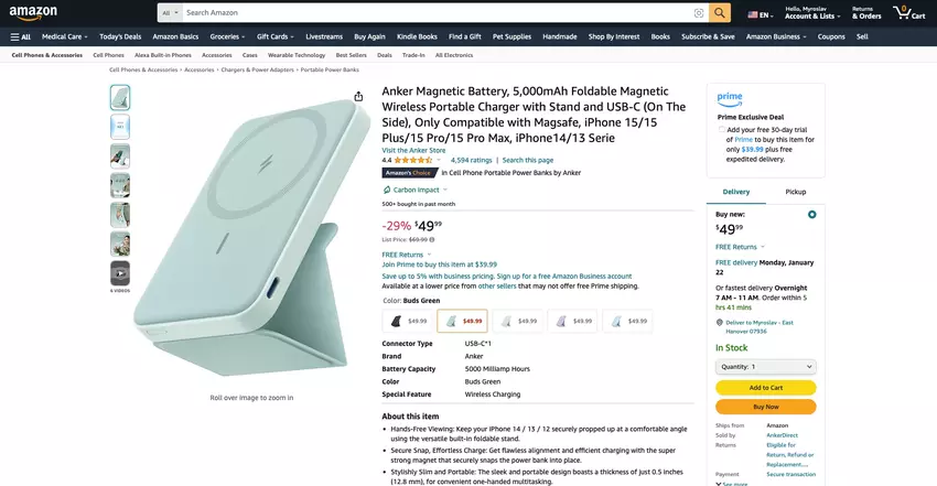 Wir sprechen über das Anker 622 Magnetic Battery Modell. Das Gerät kostet $29.99 $47.99, -38%. Es ist in fünf verschiedenen Farben erhältlich.