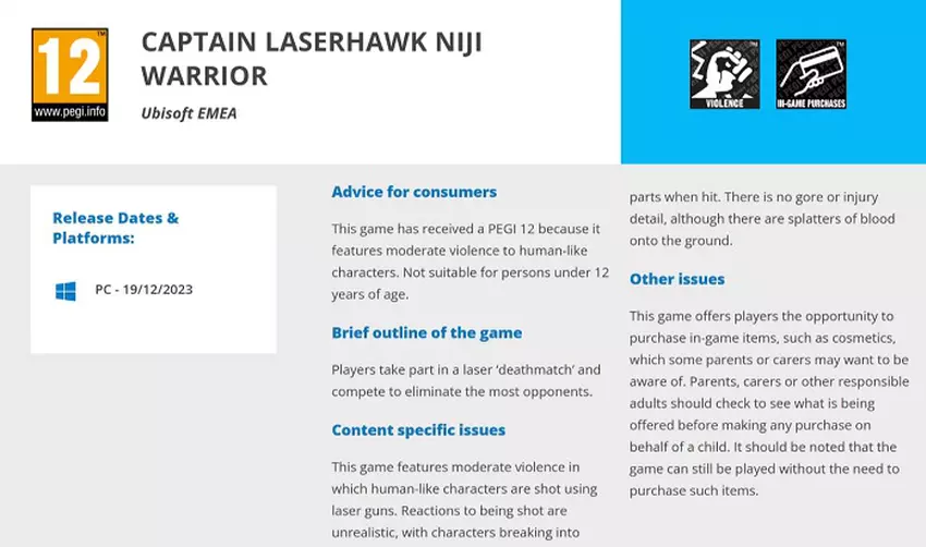 Die europäische Klassifizierungsagentur PEGI hat Captain Laserhawk eine Altersfreigabe erteilt: Niji Warrior erteilt. Dieses unangekündigte Spiel könnte der nächste Ableger der Far Cry-Serie sein.