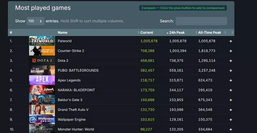 Palworld ist derzeit das beliebteste Spiel auf Steam, noch vor solchen (free-to-play)-Mastodonen der Spielewelt wie Counter-Strike 2, Dota 2, PUBG und Apex Legends.