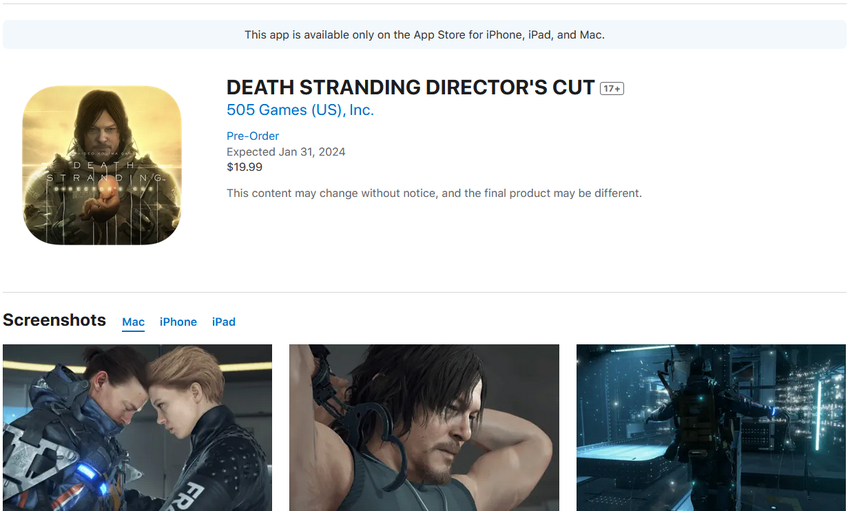 Der AppStore gibt an, dass Death Stranding Director's Cut am 31. Januar erscheinen wird, der Preis beträgt 20 Dollar. Das Spiel wird auf iPhone 15 Pro, iPhone 15 Pro Max, iPad Air und iPad Pro mit M1-Prozessor sowie auf Macs mit M1-Prozessor verfügbar sein.