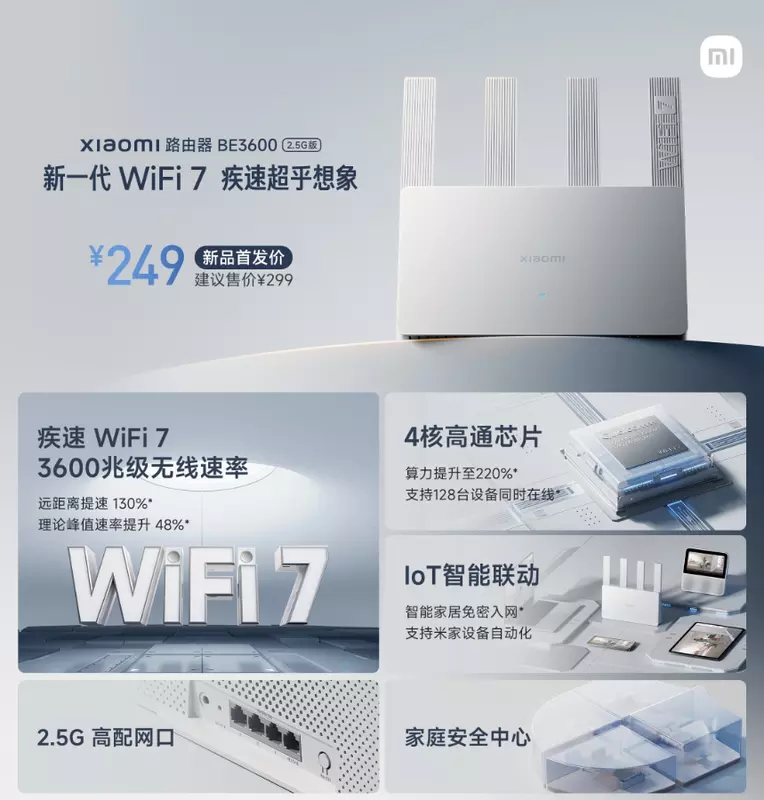 Die Neuheit wurde Xiaomi BE 3600 genannt. Nach Angaben des Herstellers handelt es sich um den günstigsten Router auf dem Markt, der den Wi-Fi 7-Standard unterstützt. Das Gerät kann in China bereits zu einem Aktionspreis von 35 Dollar erworben werden. Danach wird die Neuheit ein wenig mehr kosten.