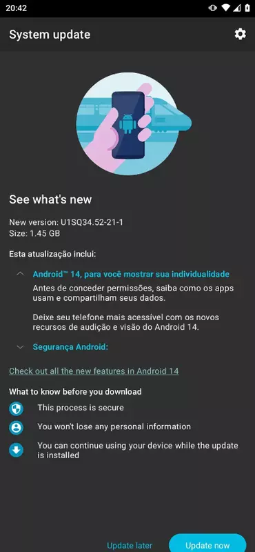 Das Update wurde mit der Build-Nummer U1SQ34.52-21-1 veröffentlicht und wiegt 1,45 GB. Das System wurde bereits in Wellen an Geräte auf der ganzen Welt verteilt. Sie können das Vorhandensein von OTA in den Einstellungen des Geräts überprüfen.