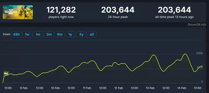 Laut SteamDB-Statistiken hat Helldivers 2 in der Spitze mehr als 200 Tausend Menschen online! Damit liegt der Shooter über den Krieg gegen außerirdische Käfer auf Platz zwei der Neuheiten des Jahres 2024, nur noch hinter Palworld.