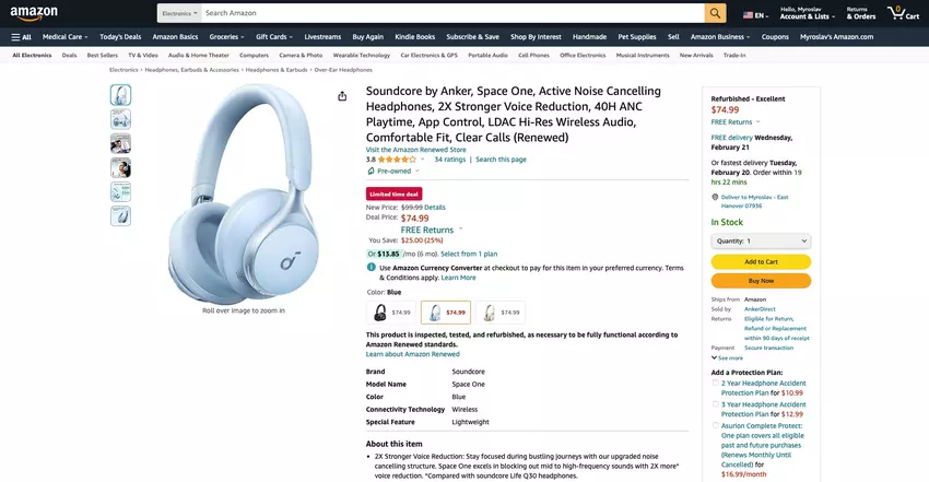 Es handelt sich um das Modell Soundcore Space One für $79.99. Es sind drei Farben erhältlich: Schwarz, Blau und Weiß.