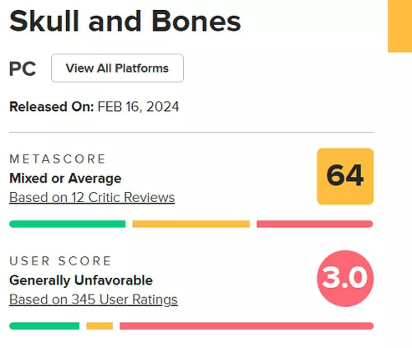 Die durchschnittliche Benutzerbewertung von Skull & Bones auf Metacritic beträgt nur 3 von 10 möglichen Punkten. Die Spieler sind nicht zimperlich in ihren Aussagen und bezeichnen das Piraten-Actionspiel als absoluten Reinfall.