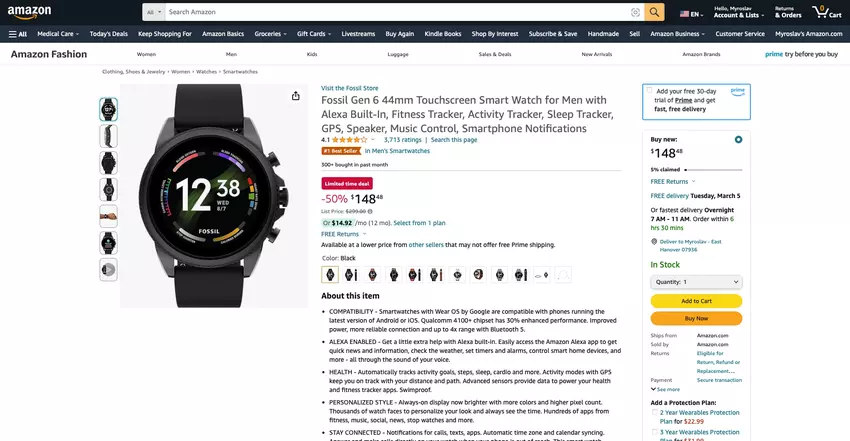 Es handelt sich um die Fossil Gen 6 mit einem 44-mm-Gehäuse und einem schwarzen Armband. Das Gerät ist jetzt auf Amazon für $122.37 $145.31, -16% erhältlich $122.37 $145.31, -16%.