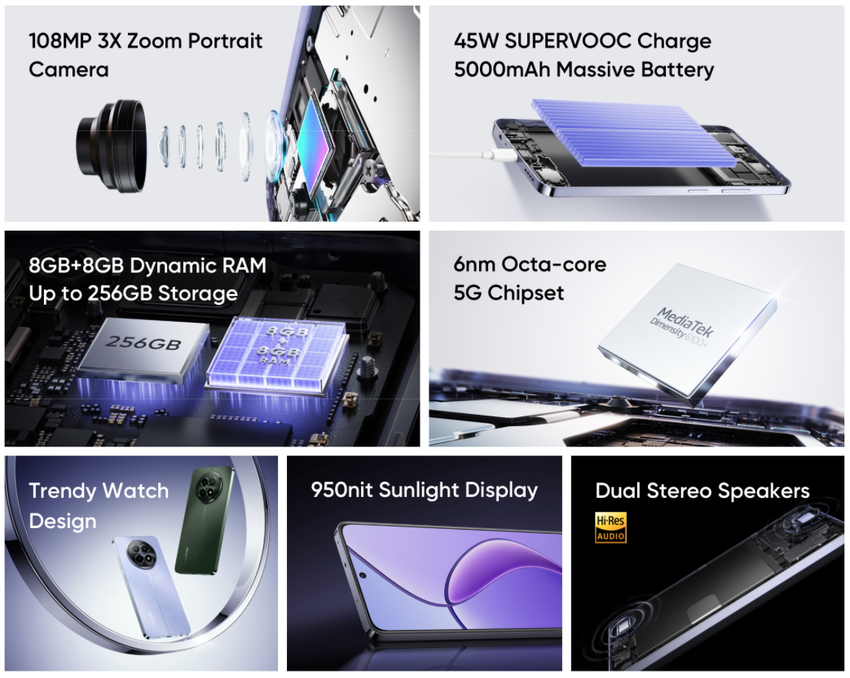 Das realme 12 5G wird von einem MediaTek Dimensity 6100+ Prozessor angetrieben, der mit bis zu 8 GB LPDDR4x RAM und 128 GB UFS 2.2 Speicher gepaart ist. Das Smartphone wird von einem 5.000mAh-Akku angetrieben und über ein 45W-Netzteil aufgeladen. Das neue Produkt verfügt über eine 108 MP + 2 MP-Hauptkamera, eine 8 MP-Frontkamera, Wi-Fi 5, Stereolautsprecher, einen 3,5-mm-Kopfhöreranschluss, einen seitlich angebrachten Fingerabdruckscanner und Bluetooth 5.3.