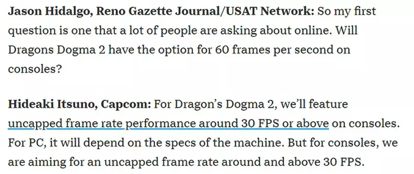 Hideaki Itsuno, Game Director von Dragon's Dogma 2, bestätigte, dass das Spiel nur auf dem PC mit 60 FPS oder mehr laufen wird.