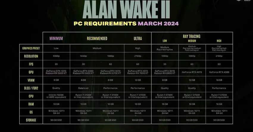 Die Entwickler haben eine detaillierte Tabelle mit den aktualisierten Anforderungen für Alan Wake 2 veröffentlicht: