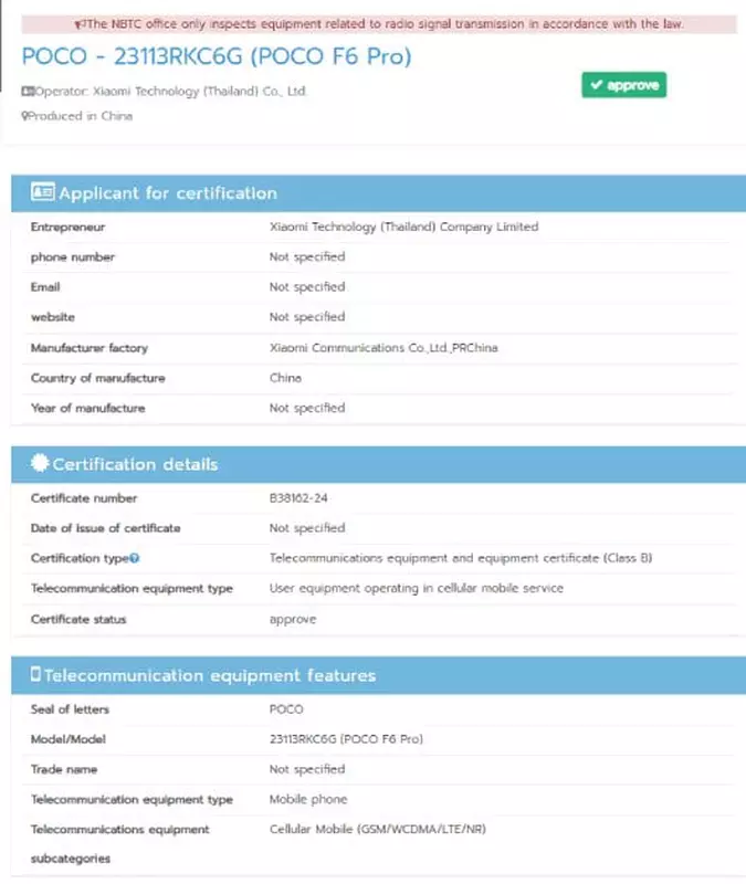 Die Rede ist von dem Modell POCO F6 Pro. Die Neuheit wurde in der Datenbank der thailändischen Zertifizierungsagentur NBTC mit der Modellnummer 23113RKC6G entdeckt. Das heißt, die Freigabe des Gadgets wird in naher Zukunft stattfinden.