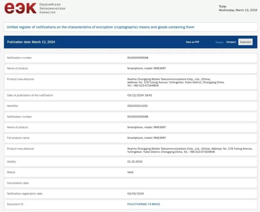 Screenshot der Realme RMX3997-Informationen in der EEC-Datenbank