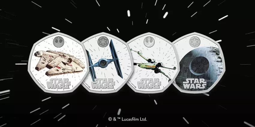 Auf ihnen sind der Millennium Falke, der imperiale TIE/ln-Fighter, der X-Wing und der ikonische Todesstern eingraviert. Die Rückseite der Münzen zeigt ein eingraviertes Profil des britischen Monarchen Charles III.