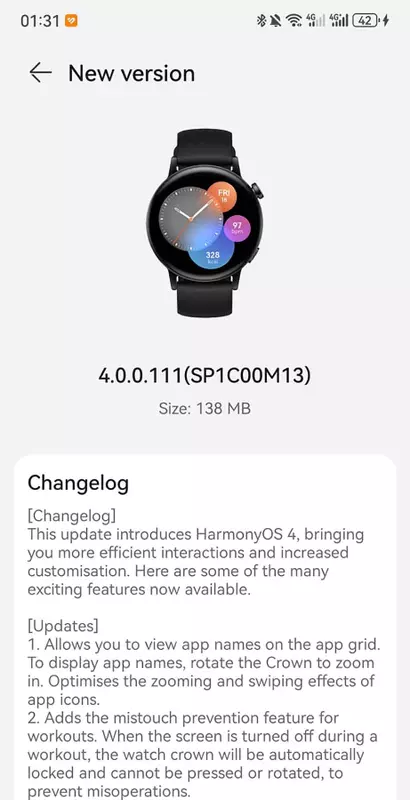 Es handelt sich um HarmonyOS 4. Das Update hat die Build-Nummer 4.0.0.0.111 und wiegt 138 MB. Das System wurde bereits in Wellen an Uhren auf der ganzen Welt verteilt. Sie können in der App auf Ihrem Smartphone nach OTA suchen.