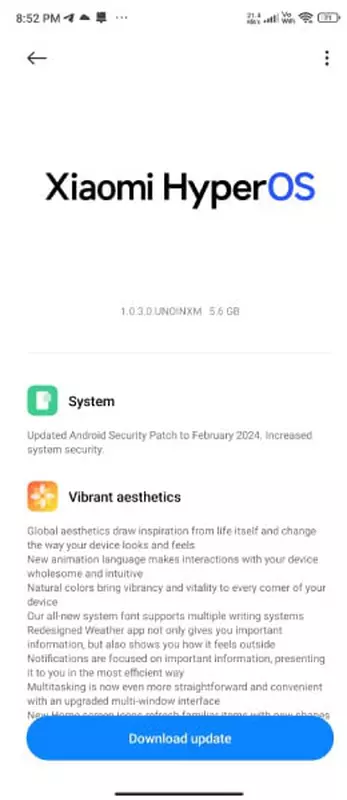 Es handelt sich um HyperOS, das auf Android 14 basiert. Das Update wurde mit der Buildnummer 1.0.3.0.0.UNOINXM veröffentlicht und wiegt 5,6 GB. Das System wird bereits von einigen Nutzern empfangen. Sie können die OTA-Verfügbarkeit in den Smartphone-Einstellungen überprüfen.