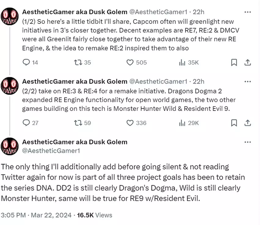 Dusk Golem führt diesen Gedanken weiter aus und meint, dass das erste der letzten drei Spiele Dragon's Dogma II war. Es folgt Monster Hunter Wilds, das auf einer aktualisierten Version der Engine entwickelt wird und ebenfalls ein Open-World-Spiel ist. Der Logik von Dusk Golem folgend, entwickelt Capcom auch Resident Evil 9 mit denselben Konzepten und Mechaniken wie die beiden oben genannten RPGs.