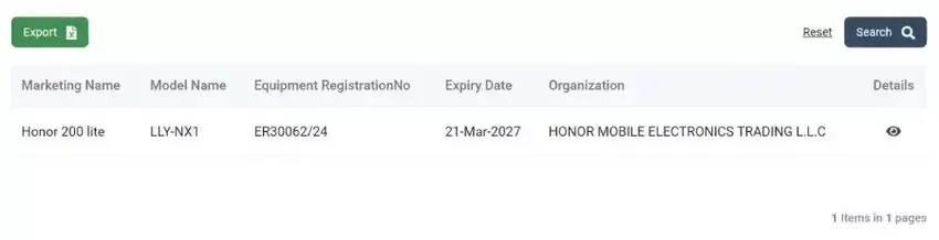 Das Honor 200 Lite mit der Modellnummer LLY-NX1 ist von der TRDA (Telecommunications and Digital Regulatory Authority) in den Vereinigten Arabischen Emiraten zertifiziert worden. Die Zertifizierung verrät außer dem Namen und der Modellnummer des Geräts nichts weiter. Es gibt also noch keine Informationen über die Spezifikationen des Geräts. Wir hoffen, dass wir das Gerät bald zu Gesicht bekommen, wie es nach der Zertifizierung normalerweise der Fall ist.