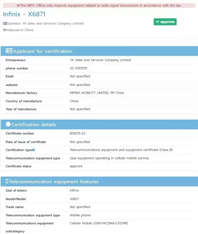 Infinix GT 20 Pro Daten bei NBTC
