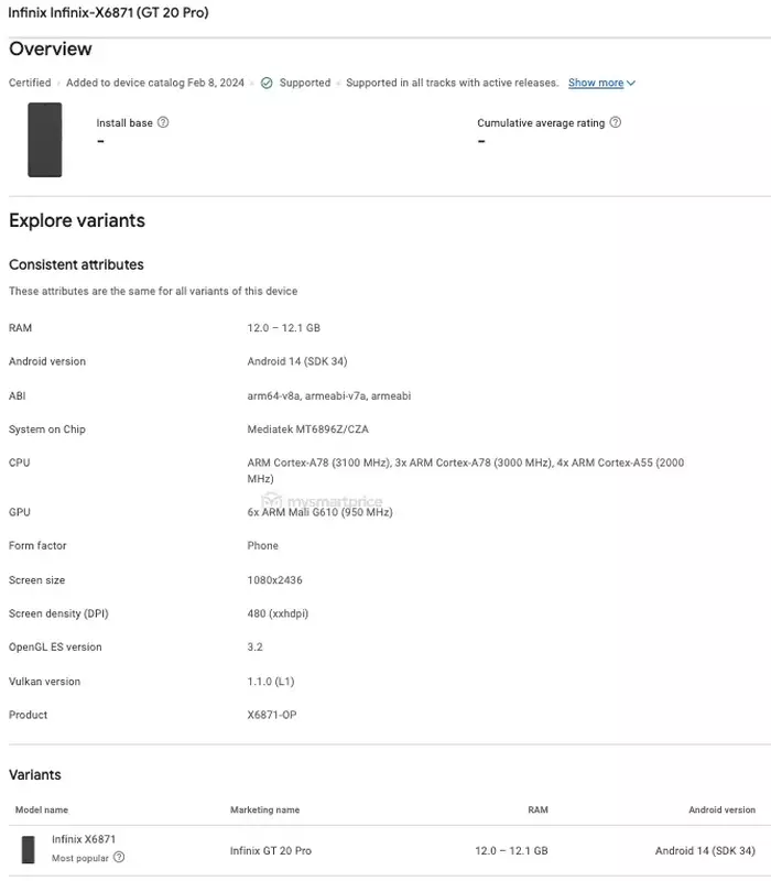 Neue Details über das kommende Infinix GT 20 Pro Smartphone sind im Internet aufgetaucht. Das Gerät mit der Modellnummer X6871 wurde auf zwei Zertifizierungs-Websites entdeckt - NBTC und Google Play Console, die das Vorhandensein eines 4nm Mediatek Dimensity 8200 Chipsatzes bestätigen. Anfang des Monats hatte Geekbench diese Informationen bereits enthüllt.