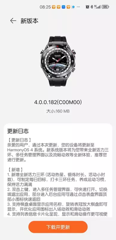 Das Update wurde mit der Nummer 4.0.0.182 veröffentlicht. Die Firmware wiegt 160 MB und wurde bereits an die Besitzer der Huawei Watch Ultimate in China verteilt. Wenig später wird das System auch für Geräte auf dem globalen Markt veröffentlicht werden.