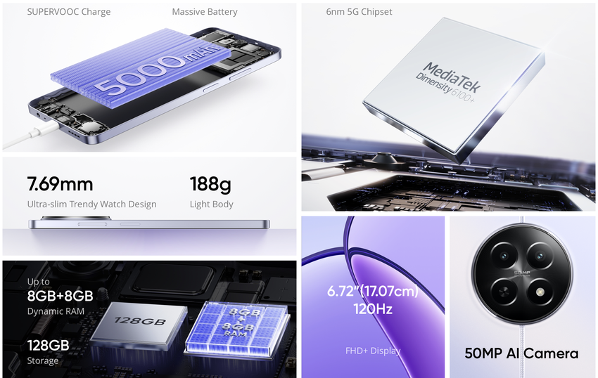 Das realme 12x 5G verfügt über ein 6,67-Zoll-LCD-Display mit 120 Hz, einen Octa-Core-Prozessor MediaTek Dimensity 6100+, einen 5000-mAh-Akku, eine 50-MP- + 2-MP-Hauptkamera und eine 8-MP-Frontkamera. Das Gerät hat einen seitlich angebrachten Fingerabdruckscanner, ist wasserdicht nach IP54 und verfügt über Stereo-Lautsprecher. Das Gerät läuft ab Werk mit dem Betriebssystem Android 14.