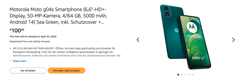 Das Moto G04s ist bereits auf Amazon für 100 Euro erhältlich. Der Verkauf des Geräts wird am 30. April beginnen.