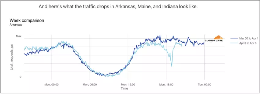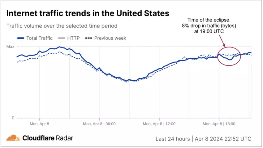 Am 8. April, während der totalen Sonnenfinsternis in den Vereinigten Staaten und Kanada, brach die Internetaktivität ein, als die Menschen nach draußen gingen, um das Naturphänomen zu beobachten. Nach Angaben von Cloudflare, einem Anbieter von Internet-Infrastruktur, ging der Internetverkehr in diesen Regionen während der Sonnenfinsternis für mehrere Minuten zurück.