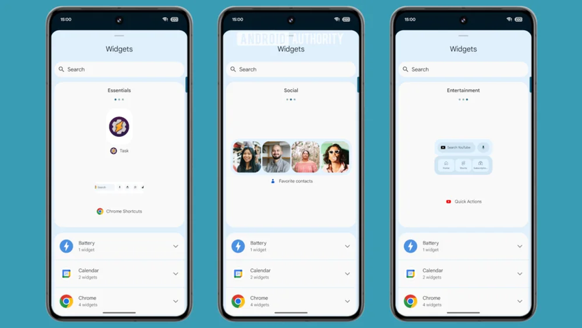 Darüber hinaus verbessert der Pixel Launcher die Widget-Empfehlungen in Android 15. In der aktuellen Version wird beim Öffnen der Widget-Auswahl in Pixel Launcher ein zufälliges Widget am oberen Rand der Seite angezeigt. Das neue Empfehlungssystem bietet mehr Optionen zur Auswahl und kategorisiert die Empfehlungen nach Typ, was es einfacher macht, das richtige Widget zu finden.