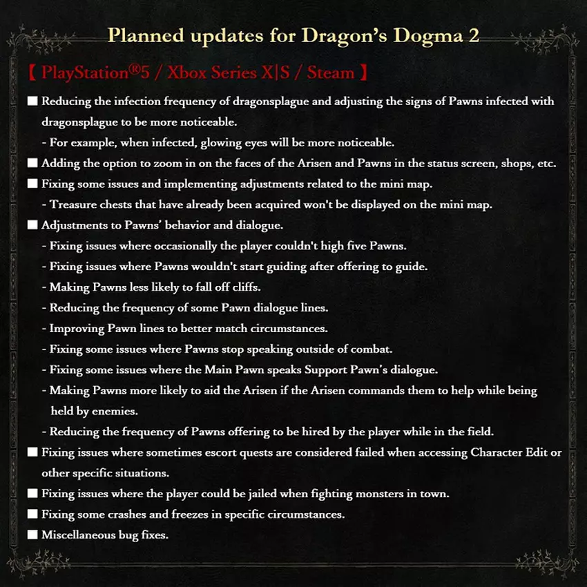 Die Spieldesigner werden Fehler in der Charakterbegleitung beheben, die bei einigen Aktionen des Spielers auftraten. Außerdem werden Glitches in Dragon's Dogma II sowie allgemeine technische Probleme behoben.