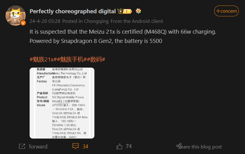 Jetzt hat ein anderer chinesischer Blogger mitgeteilt, dass das Gerät mit der Modellnummer M468Q in der 3C-Zertifizierung 66W Aufladung unterstützt, was vermutlich das Meizu 21X ist.