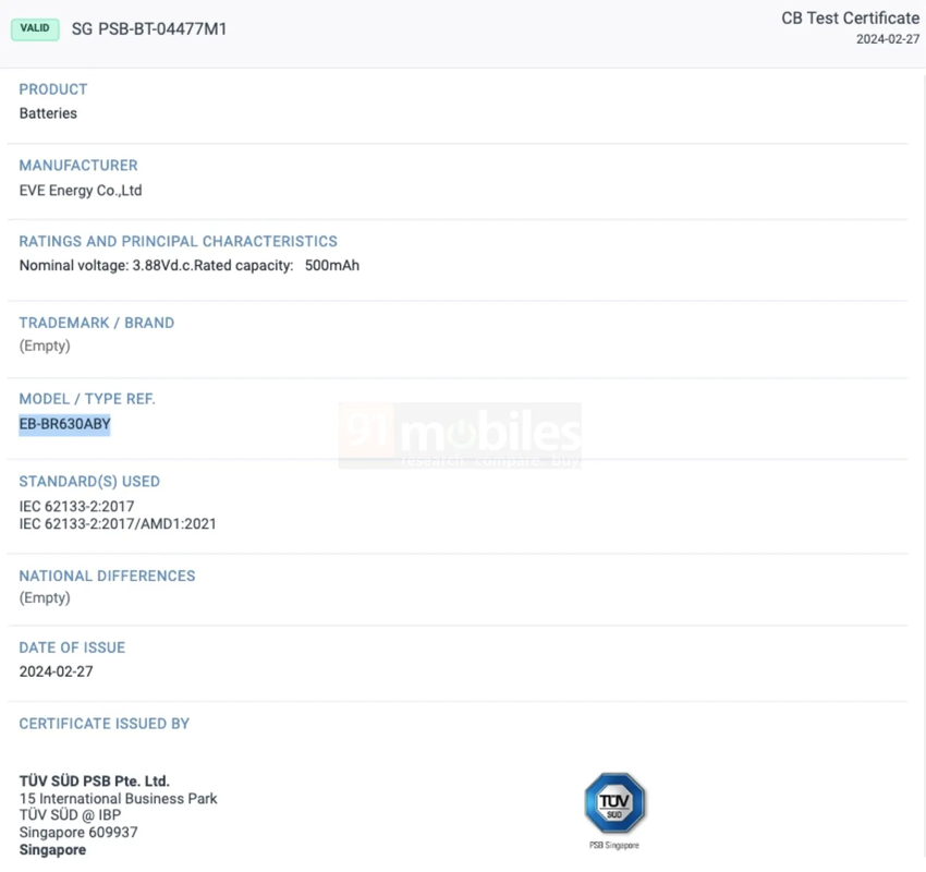 Die Galaxy Buds 3 Pro sind auf Zertifizierungsseiten unter der Modellnummer EB-BR630ABY aufgetaucht. Es sieht so aus, als ob die Galaxy Buds 3 Pro-Ladehülle die gleiche Akkukapazität - 500 mAh - haben wird wie die Galaxy Buds 2 Pro-Hülle. Es sollte betont werden, dass die angegebene Kapazität nominal ist. Samsung gibt offiziell die typische Kapazität an, die normalerweise etwas höher ist. Die Galaxy Buds 2 Pro haben zum Beispiel eine Ladekapazität von 515 mAh.