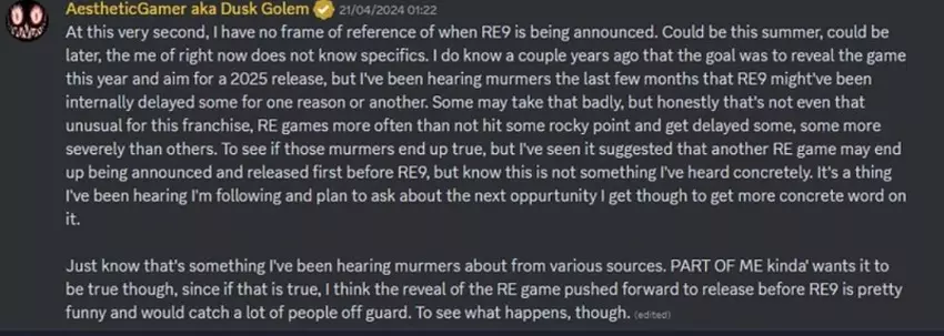Der Insider Dusk Golem hat wiederholt Informationen über Resident Evil 9 geteilt und eine seiner Hauptthesen war die Veröffentlichung des neuen Horrorspiels von Capcom im Jahr 2025.