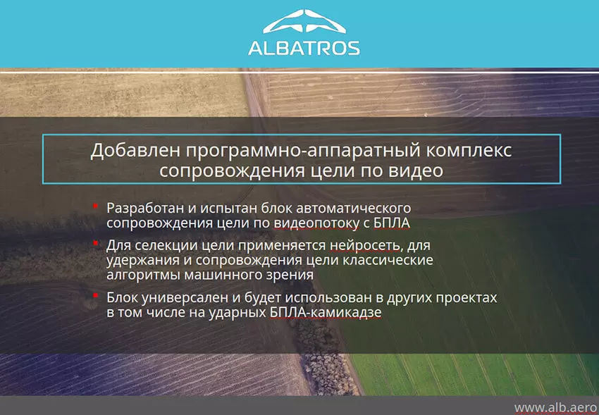 Ein Teil der Präsentation wird sich auf die Implementierung von Bildverarbeitungsfunktionen unter Verwendung des neuronalen Netzwerks konzentrieren, das den Prozess der Suche, Auswahl und Verfolgung erkannter Ziele automatisiert. Das in Zusammenarbeit mit Kaspersky Lab entwickelte Bildverarbeitungssystem wurde in die Aufklärungsdrohne Albatross M5 integriert.