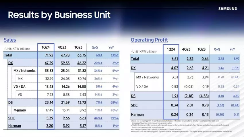 Samsung hat detaillierte Finanzergebnisse für das erste Quartal 2024 veröffentlicht, und die sind wirklich positiv. Der Gewinn des koreanischen Giganten belief sich auf 6,61 Billionen Won (4,85 Milliarden Dollar), das ist zehnmal mehr als im gleichen Zeitraum des letzten Jahres.