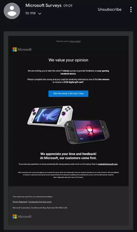 Es ist bekannt geworden, dass die Abonnenten des Microsoft-Newsletters für E-Mail-Abonnenten eine Umfrage zu tragbaren Konsolen erhalten. Das Unternehmen interessiert sich dafür, ob Gamer solche Geräte nutzen, welche Hersteller sie bevorzugen, ob die Konsole Spiele nativ ausführen sollte oder Cloud-Gaming ausreicht, welche Faktoren die Wahl der Konsole beeinflussen, welche Größe sie haben sollte und vieles mehr.