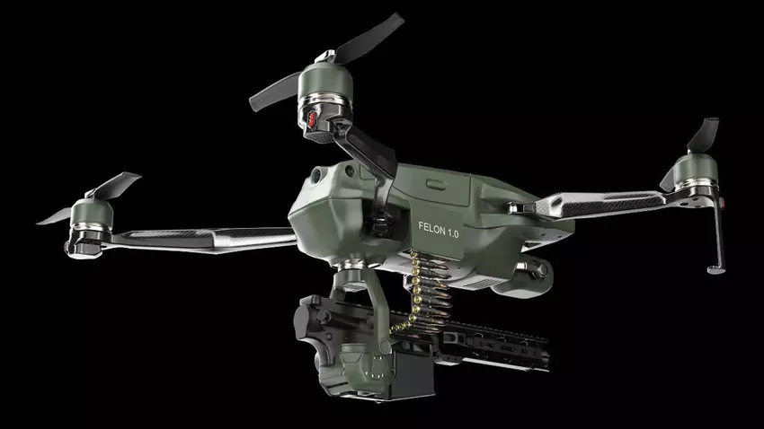 - DieFelon1.0 ist mit einem 5,56-mm-Maschinengewehr mit einzigartiger Präzision ausgestattet. Die Drohne eignet sich hervorragend für die Luftaufklärung, die Unterdrückung von Infanterie und die Sicherung der Umgebung.