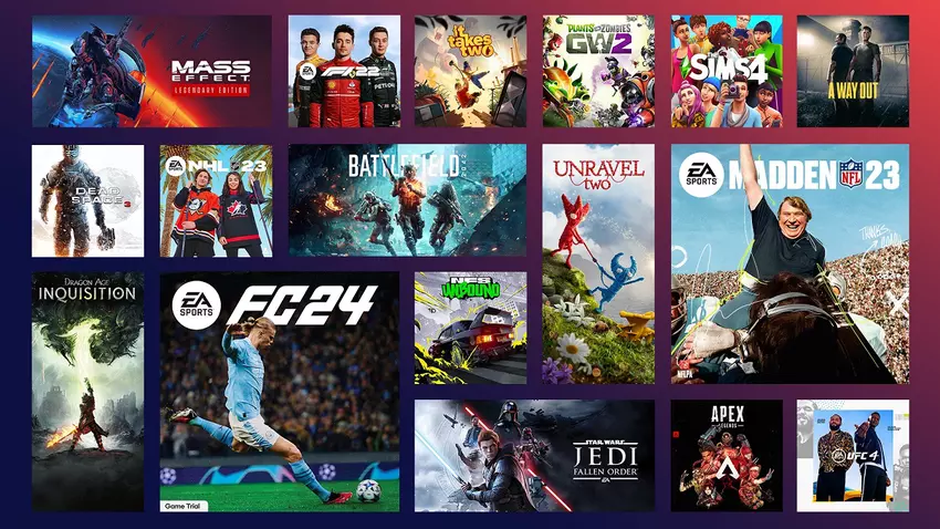 Der Aktionskatalog umfasst Spiele wie EA SPORTS FC 24, Battlefield 2042, Star Wars Jedi: Survivor, Need for Speed Unbound, It Takes Two, EA Sports WRC, Command & Conquer The Ultimate Collection mit 17 Spielen, Titanfall 2 und viele andere.