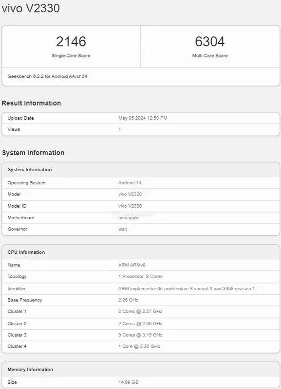 Das Smartphone mit der Modellnummer V2330 tauchte in der Datenbank des Geekbench-Leistungstests auf. Darüber hinaus hat das Gerät die Zertifizierung durch die indonesische Behörde bestanden. Das heißt, die weltweite Veröffentlichung der Neuheit dürfte in naher Zukunft erfolgen.