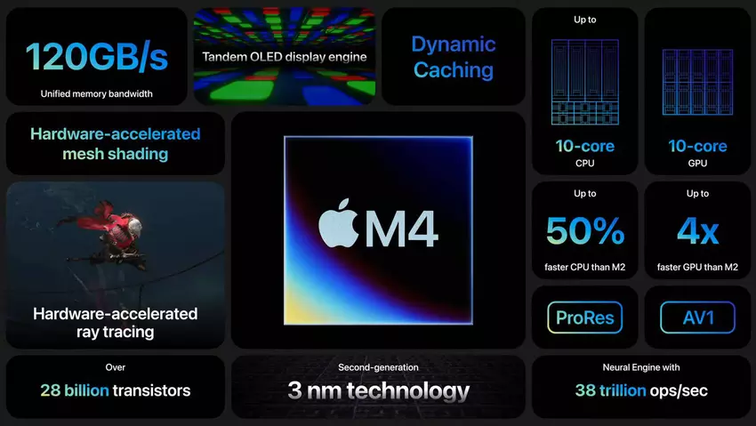 Apple legt einen besonderen Schwerpunkt auf die Fähigkeiten der künstlichen Intelligenz. Zu M4 gehört die Neural Engine, die künstliche Intelligenz-Workloads beschleunigt. Nach Angaben des Unternehmens handelt es sich um die leistungsstärkste Neural Engine in der Geschichte des Unternehmens - sie kann 38 Billionen Operationen pro Sekunde ausführen.