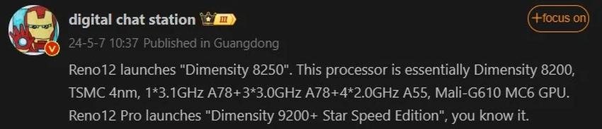 Der Insider fügte außerdem hinzu, dass das Reno 12 Pro mit Dimensity 9200+ ausgestattet sein könnte, das als Dimensity 9200+ Star Speed Edition vermarktet werden könnte. Es wird daher erwartet, dass das Reno 12 Pro mit dem Dimensity 9200+ SoC auf den Markt kommt.