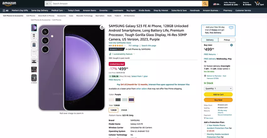 - Samsung Galaxy S23 FE, 256 GB (Violett, Creme, Graphit und Mint) - $659.99.