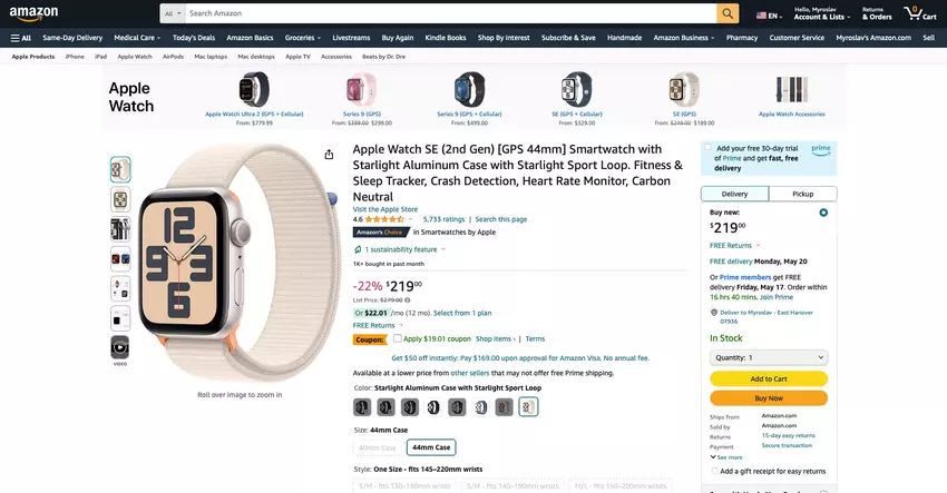 Die 44-mm-Smartwatch mit Starlight-Farbe und Starlight-Sport-Loop-Armband ist für $252.49 $279.00, -10% zu haben $252.49 $279.00, -10%. Darüber hinaus bietet Amazon auch einen Coupon mit einem zusätzlichen Rabatt von $19 an.