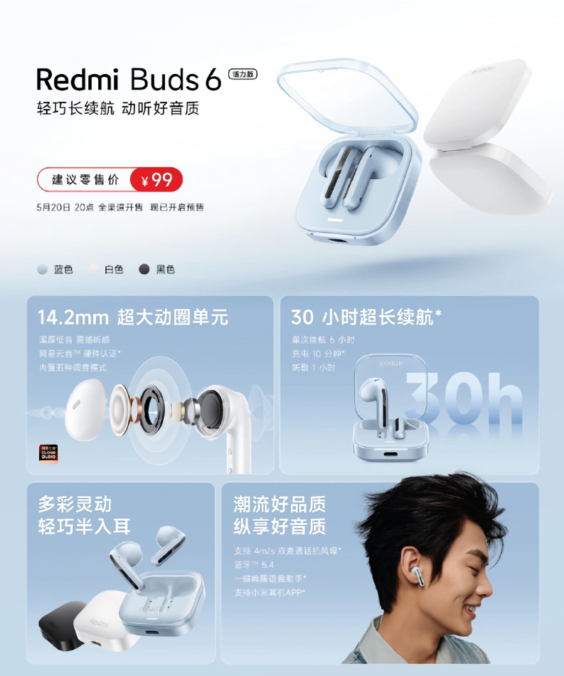 Das Modell wurde Redmi Buds 6 Active genannt. Die Neuheit hat ein Gehäuse mit einer durchsichtigen Abdeckung und drei Farben: schwarz, weiß und blau. Die Kopfhörer verfügen über 14,2-mm-Treiber und ein Bluetooth 5.4-Modul. Das Gerät verfügt über einen Low-Sound-Delay-Modus (90 ms), ein duales Mikrofonsystem und einen IPX4-Schutz vor Wassertropfen und Schweiß.