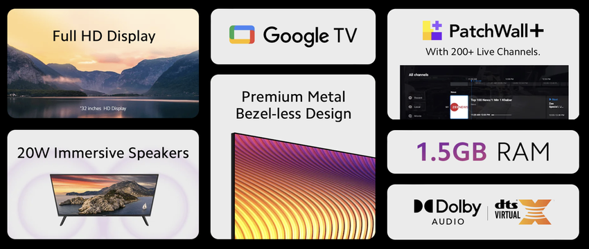Die Fernseher haben Google TV an Bord und verfügen über eine Patchwall+-Schnittstelle. Die Neuheiten verfügen über ein 20-W-Audiosystem mit Dolby Audio- und DTS:X-Unterstützung. Zu den Anschlüssen gehören HDMI, USB 2.0 und Ethernet. Die TVs unterstützen Chromecast.