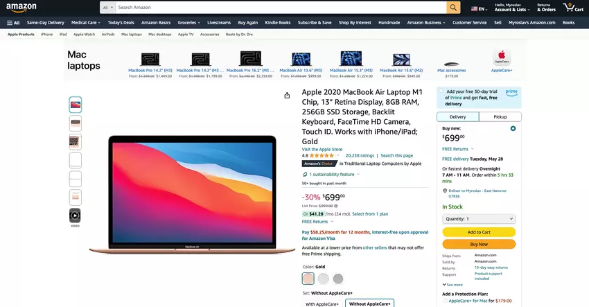 Der Laptop wird von einem proprietären M1-Prozessor angetrieben, der mit 8 GB RAM und einer 256 GB großen SSD gepaart ist. Es stehen drei Farben zur Auswahl: Silber, Space Grau und Gold.