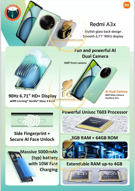 Insider @passionategeekz hat Marketing-Bilder des Redmi A3x veröffentlicht, die die Spezifikationen des Geräts enthüllen.