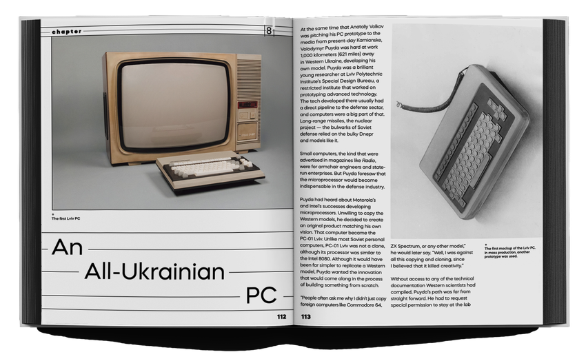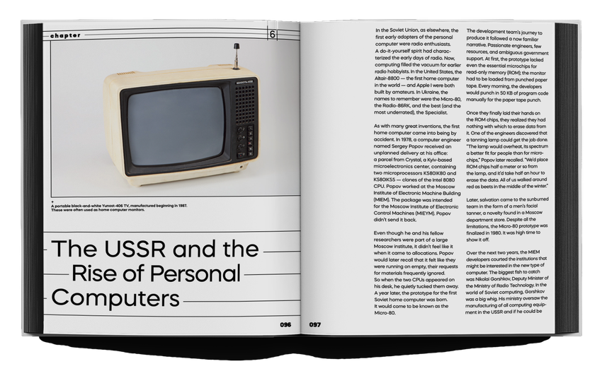Der erste Teil des Buches behandelt die Geschichte der Kybernetik in der Ukraine von den 1940er Jahren bis 1991 und ist mit Dutzenden von seltenen Archivfotos illustriert. Der Leser erfährt mehr über die Hintergründe der Entwicklung der ersten Computer in der Ukraine, über die herausragenden Ingenieure und Wissenschaftler, die hinter dem Eisernen Vorhang die Computerära einleiteten, und über die Bedingungen, unter denen sie arbeiteten. Die im Buch wiedergegebene Technikgeschichte basiert auf Dutzenden von Interviews mit Personen, die die wichtigsten Innovatoren der damaligen Zeit persönlich kannten: Kollegen, Verwandte und Schüler der Kybernetik-Pioniere Viktor Glushkov und Sergei Lebedev.
