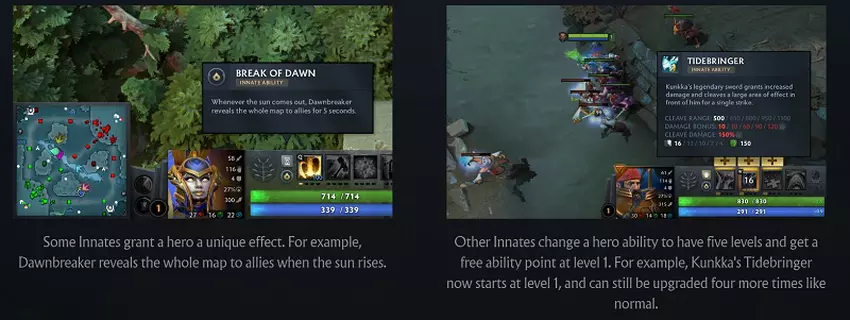 • Andere fügen einer regulären Fähigkeit eine zusätzliche Stufe hinzu und machen sie von Anfang an verfügbar - zum Beispiel hat Kunkka von Anfang an die Fähigkeit "Gezeitenbrecher" und kann sie vier weitere Male erlernen. Dasselbe gilt für die Kommandantin der Legion und ihre Fähigkeit Moment des Mutes.