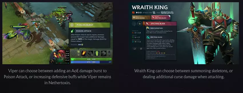 • Aspekte wirken sich auf viele verschiedene Arten auf Helden aus. Zum Beispiel kann Viper entweder sofortigen Schaden um ein Giftangriffsopfer herum hinzufügen oder im Wirkungsbereich von Nethertoxin überlebensfähiger werden, während Wraith King entweder Skelette beschwören oder mit seinen Angriffen zusätzlichen Jinx-Schaden verursachen kann.