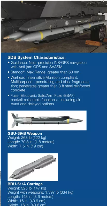 Die GBU-39/B SDB ist 1,8 m lang und 19 cm breit. Die Bombe mit kleinem Durchmesser wiegt 122 kg. Die maximale Abschussreichweite beträgt 110 Kilometer, aber es ist nicht sicher, dass sowjetische Kampfflugzeuge diesen Wert erreichen können.
